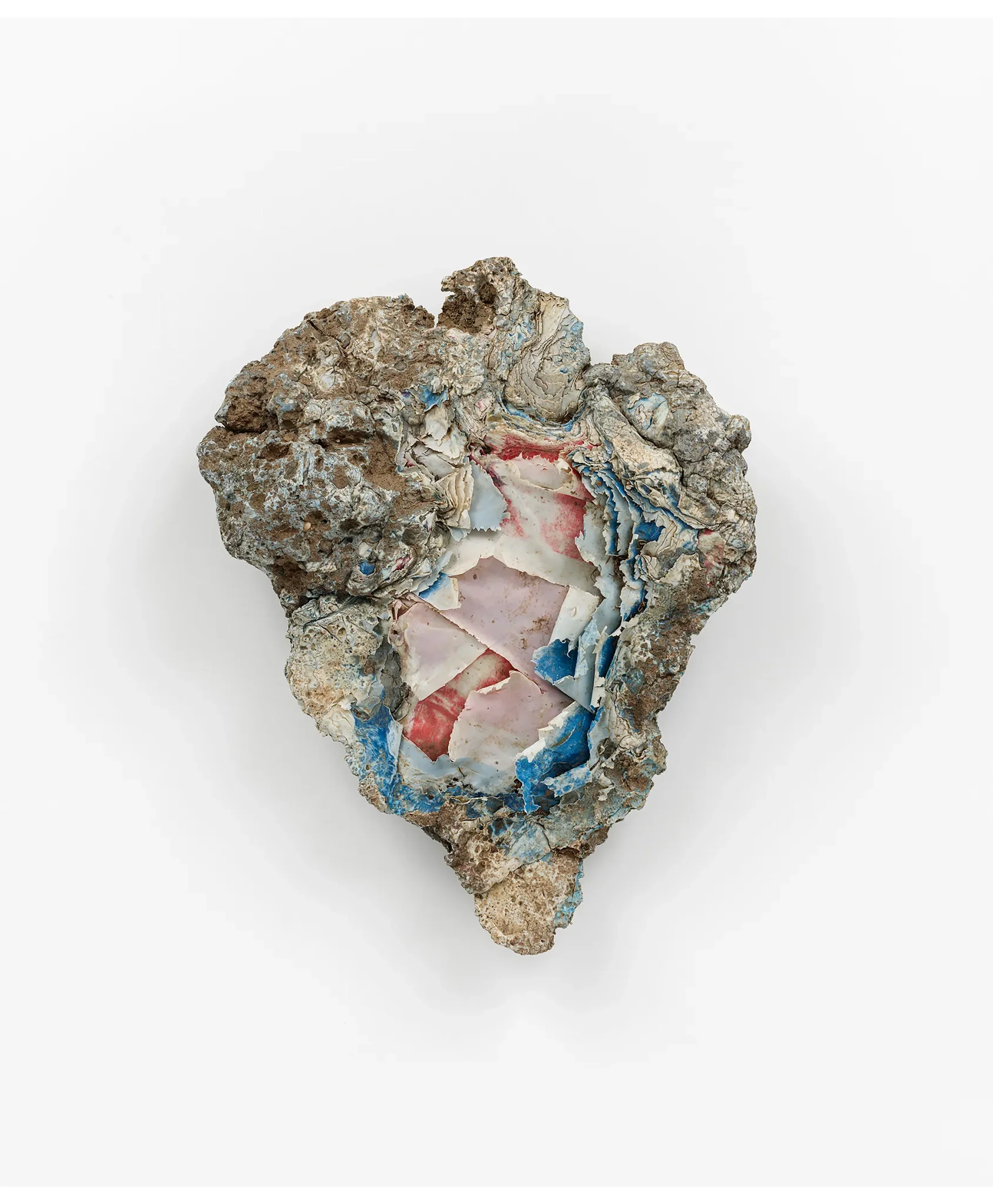 ‘I found this lump of plastic in a field near to where I live in West Wales. It looked like a ‘heart’ or a ‘continent’. I felt the object was a metaphor for farming culture and how plastic is becoming ingrained in our earth. The red, white and blue colours also resonate with Britain’s position as one of the most nature depleted nations on earth’.