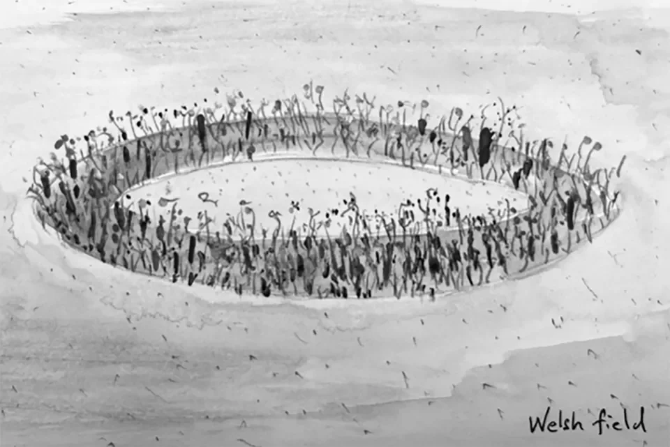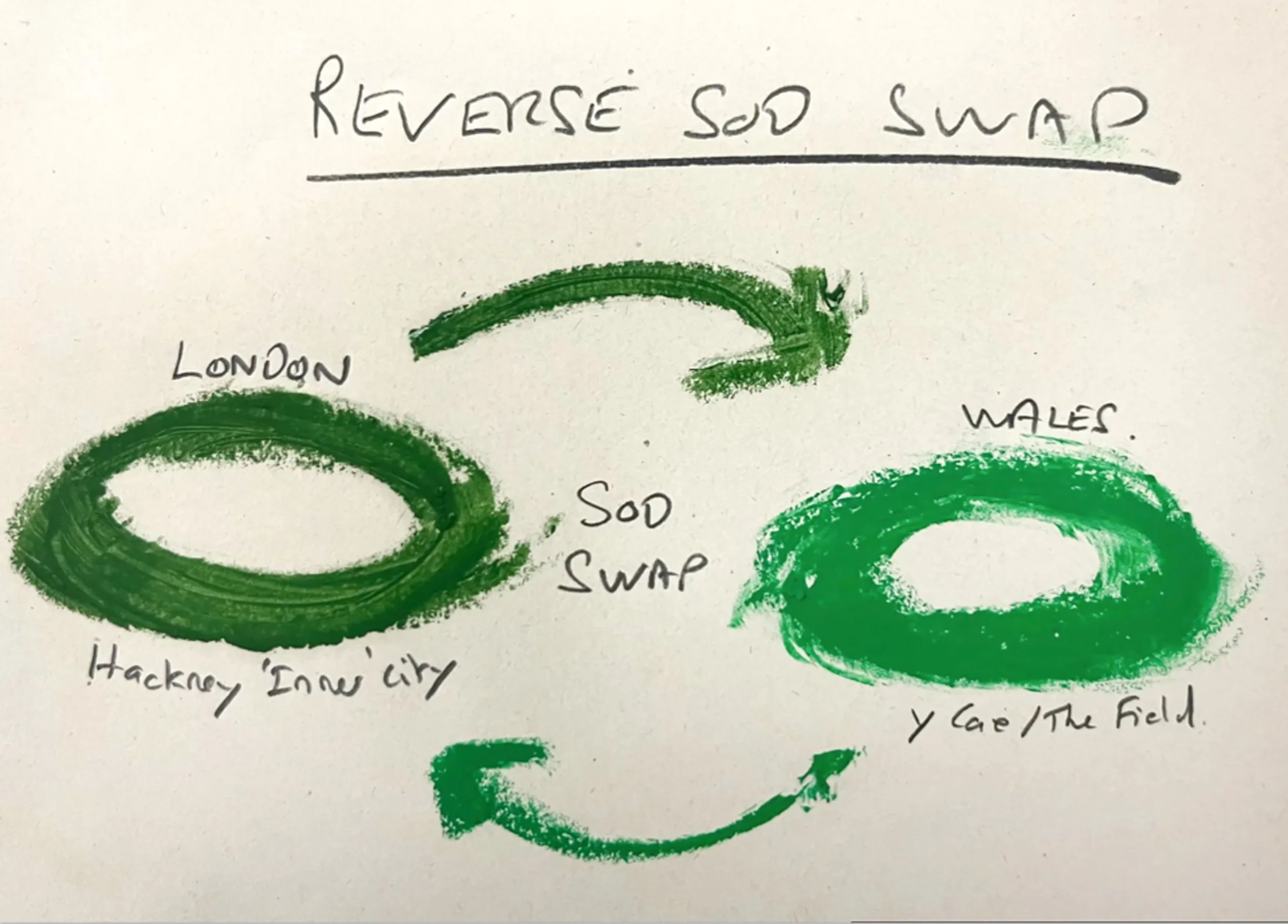 Reverse Sod Swap (RSS) is a living sculpture about the beauty and importance of diversity in nature and the beauty of diversity in community. Working with Hackney Council, The London turf circle will be taken from Springfield Park, one of the most ethnically diverse areas of Britain. The Welsh turf will be taken from a sheep field adjacent to Perry’s studio at Ffynnonofi, North Pembrokeshire. The field is part of Y Cae, a new Art Ecology experimental project where he is working with artists and ecologists to help rewild 12 acres of degraded land. A botanist will count the species in both turf circles. David Nash beautifully archived his Sod Swap concept with drawings. Perry intends to document the project with a film and photography.