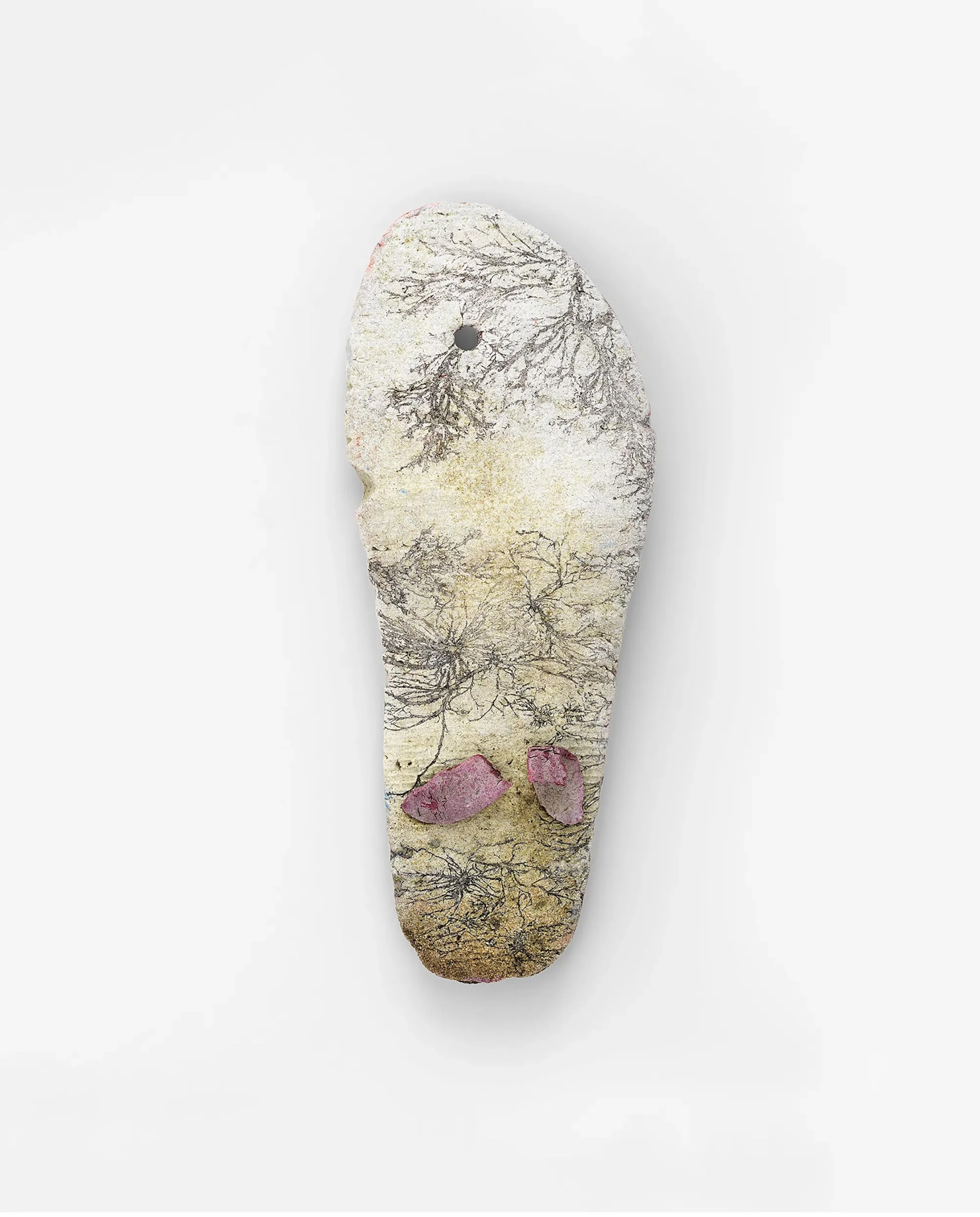 On closer inspection, there appears to be something else to absorb, in these highly detailed and forensically photographed objects. The degrading effect of the sea has created extraordinary forms and surfaces. Are we allowed to enjoy nature’s continuous eroding process and the painterly effects caused by the interaction of sun, sea and sand? The repetitive presentation also provides a rhythm of colour and form and allows relationships to develop between the individual specimens. Compare the delicate almost hand painted veins and striations of Flip Flop 13 with the pitted orange fossil like remains of Flip Flop 3 or the bright ‘Kleinest’ purple of Flip Flop 11 with the leather-like map surface of Flip Flop 12.