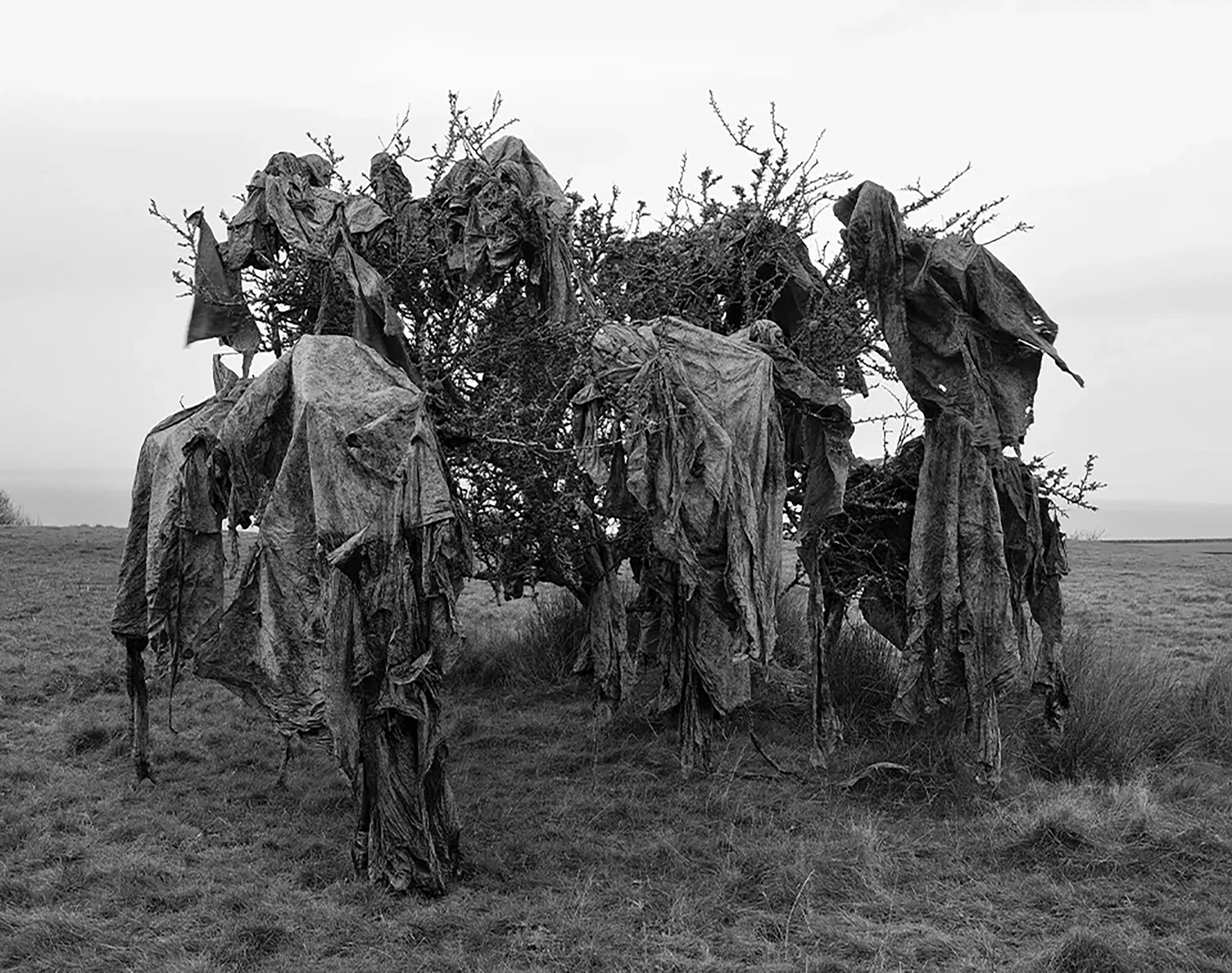 In Veiled Thorn, Mike Perry hangs agricultural sheeting, he found in a nearby field, over the branches of a Blackthorn tree. The resulting shapes create a forbodding atmosphere that echo the human forms in Rodin’s classic 1884 sculpture, The Bhurgers of Calais. Or maybe a scene from the witches in Macbeth. This post apocalyptic image suggest a dystopian future where plastic waste overruns nature. Perry points to recent scientific studies that indicate there is today over 20 times more plastic in our soils than in the oceans.