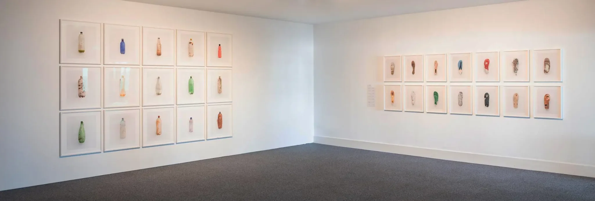 This exhibition brings together two recent bodies of work: Wet Deserts and Mor Plastig. Wet Deserts focuses on mundane and typically overlooked locations in Britain, often in places referred to as areas of natural beauty, our national parks, but where there is clear evidence of man’s impact. Môr Plastig (Welsh for ‘plastic sea’), an ongoing body of work that classifies objects washed up by the sea into groupings – Bottles, Shoes, Grids, captures the intriguing surface detail by using a high-resolution camera.