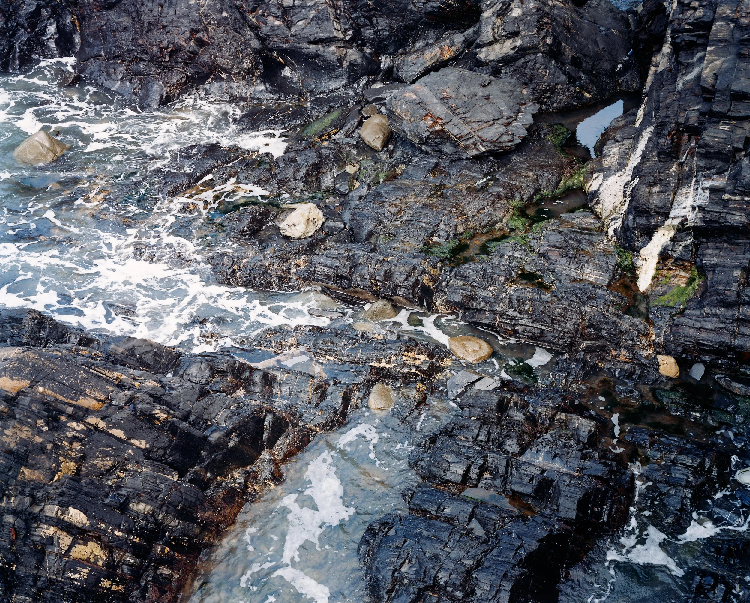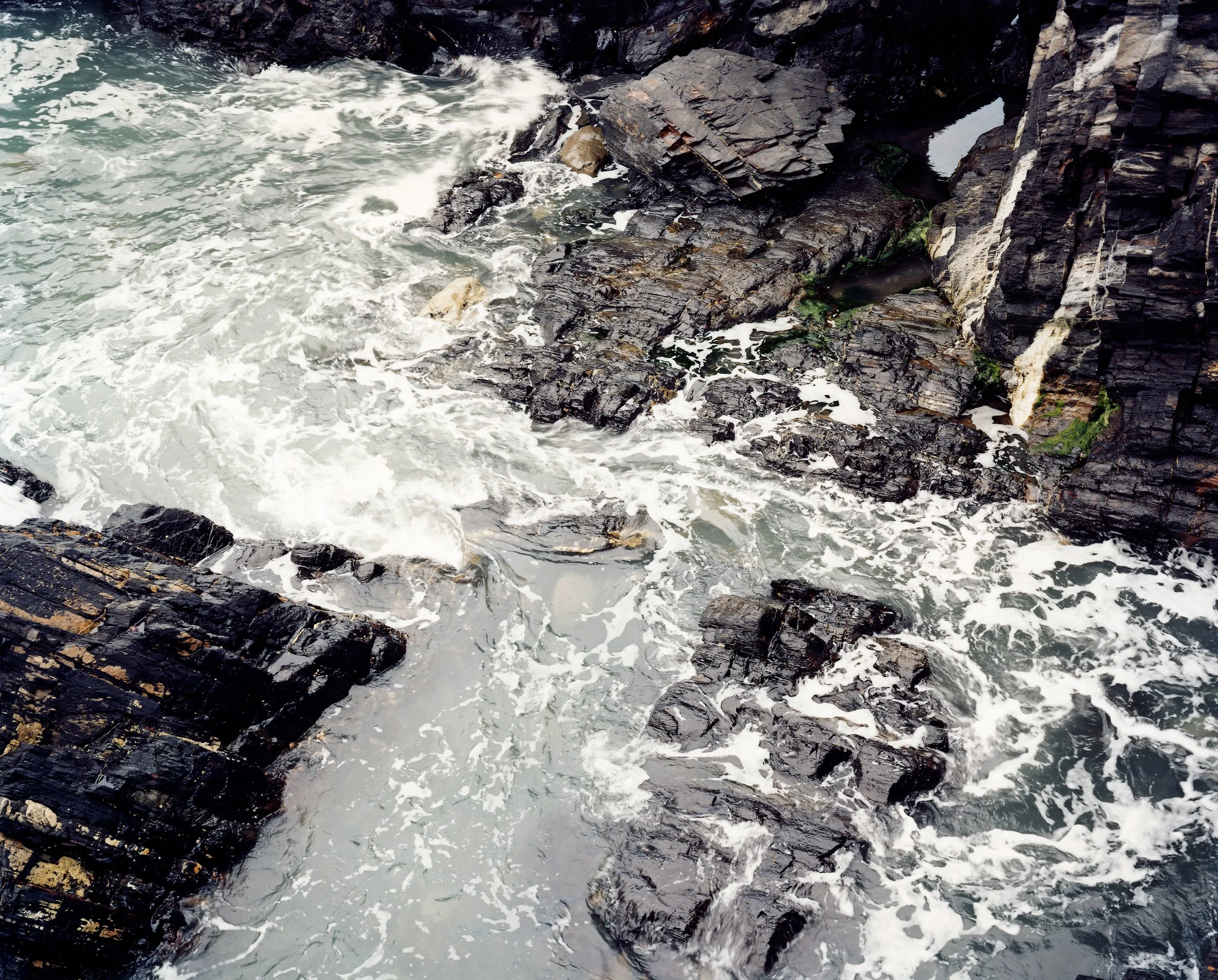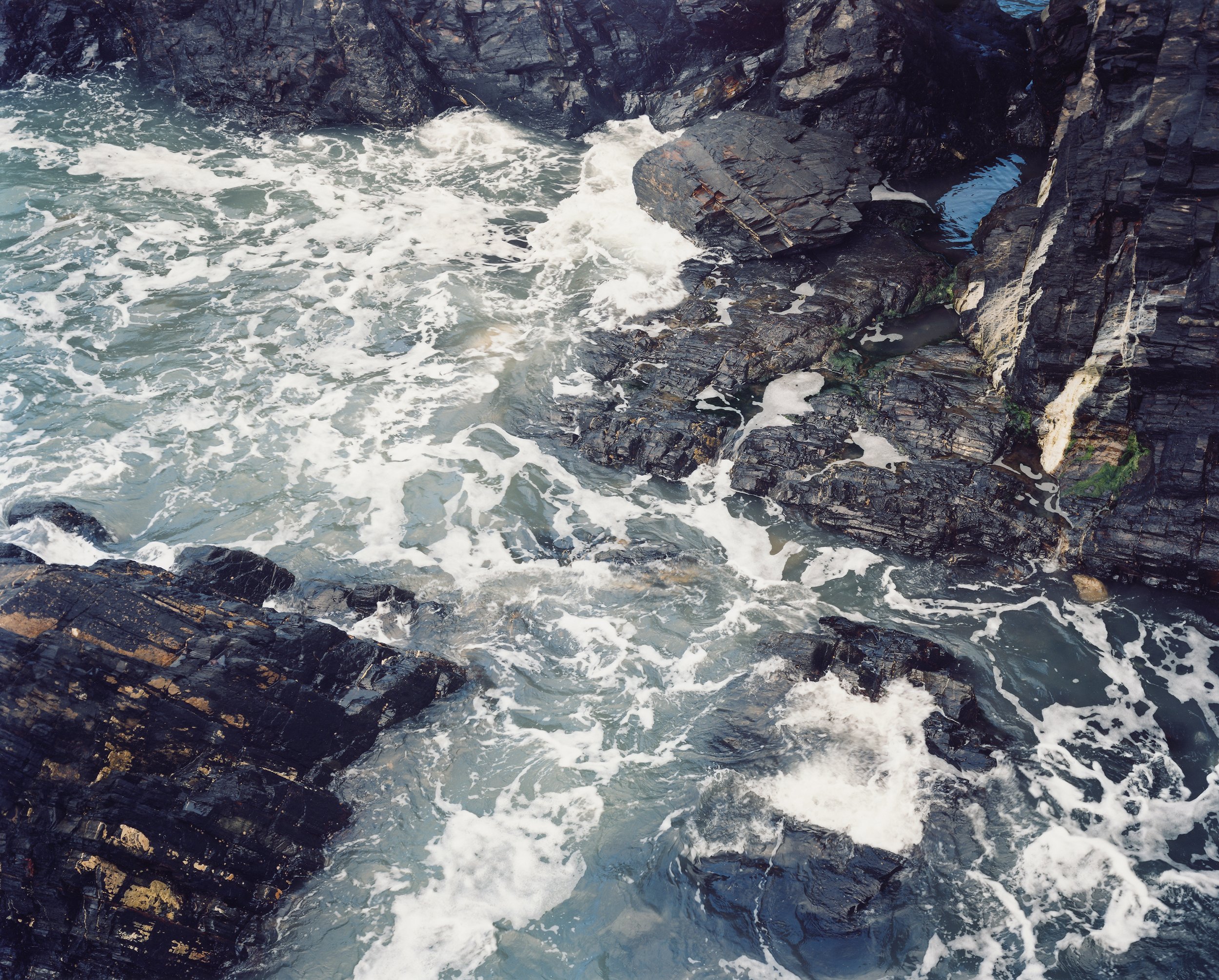 Perry’s ongoing interest in abstract art and its relation to Modernist photography remains a powerful stimulus at Abereiddi. The flattened space and vertiginous perspective allow abstraction to overtake depiction. The combination of dark, intractable blocks of stone and scribbles of white foam suggests the alternating spaces of order and turmoil in a Jonathan Lasker abstract. Water pools in the bay and between rocks like washes of cool, translucent pigment. In one picture, a patch of sky, reflected in a still pool in the upper right of the picture, glows with a purity of blue like some celestial witness to all this non-stop impermanence. In another, taken perhaps just minutes later, the same pool shivers with sudden, extraordinary beauty. These seascapes bring to mind William Blake’s grain of sand in which he asks us to find infinity. The sea foam dances and twirls like creamy nebulae in the Milky Way. Look again and the whole universe seems to be crashing against the rocks. Surely that’s enough.