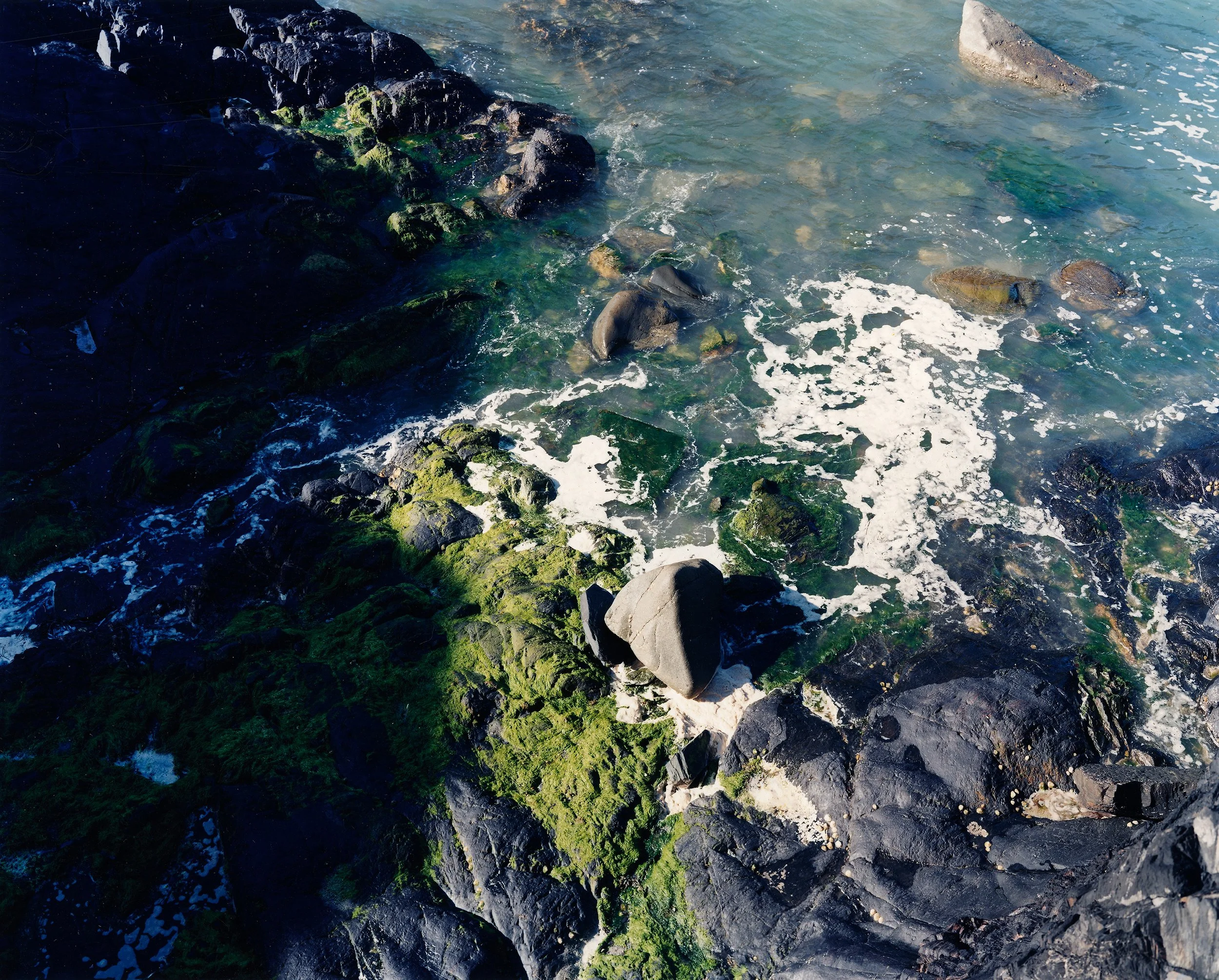 Mike Perry looks down upon the Abereiddi shoreline with humility and awe. The beauty he finds there is so unaware of its audience, so self-contained, that it almost punishes the vanity of the pleasure we find in it. Yet, where exactly, is the artist? The position of the camera is difficult to identify or measure; the photographs seem to be taken as if the camera were hovering, impossibly, above the rocks. We don’t experience the landscape as if from the perspective of an artist seeking a picturesque composition, but rather as if from the casual glance of a seagull, stone or tuft of grass. This denial of a dramatic or picturesque composition grants the landscape a fierce independence.