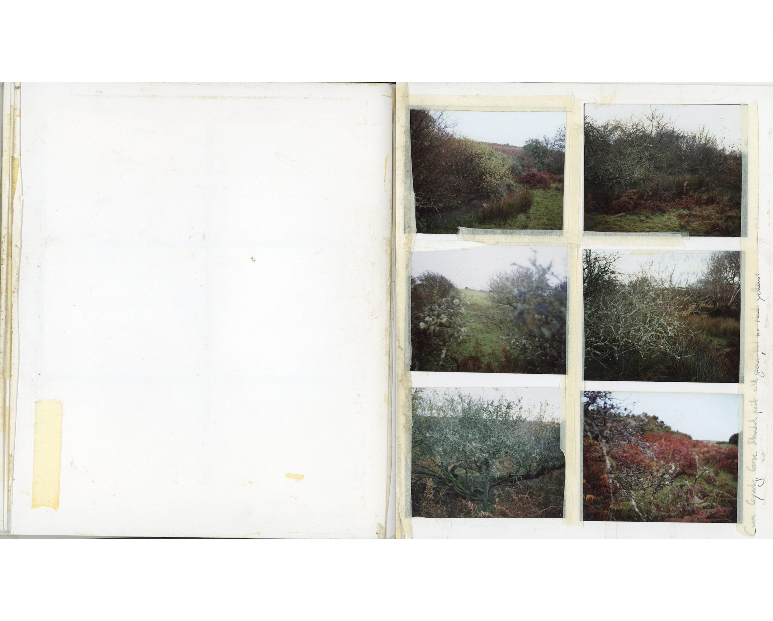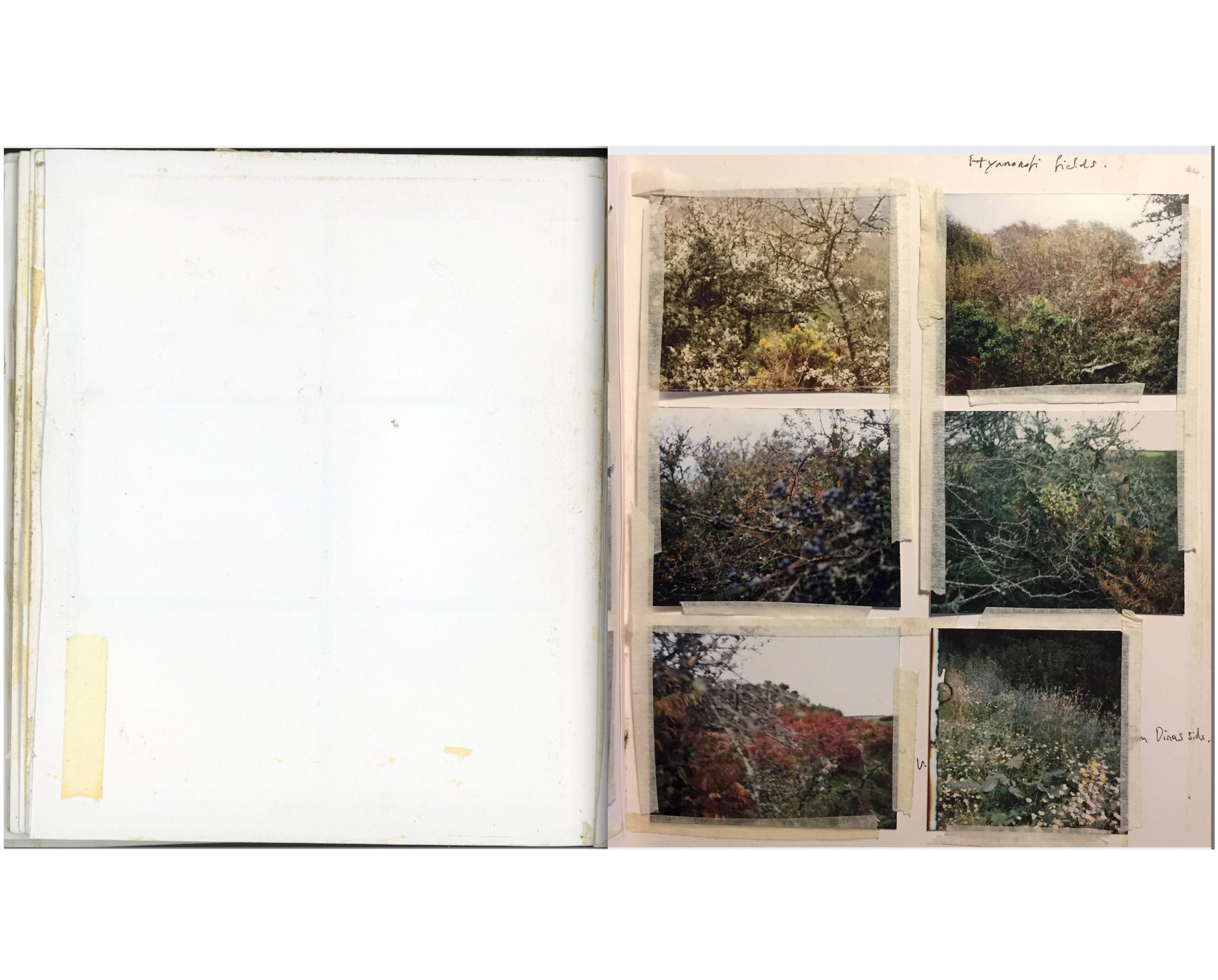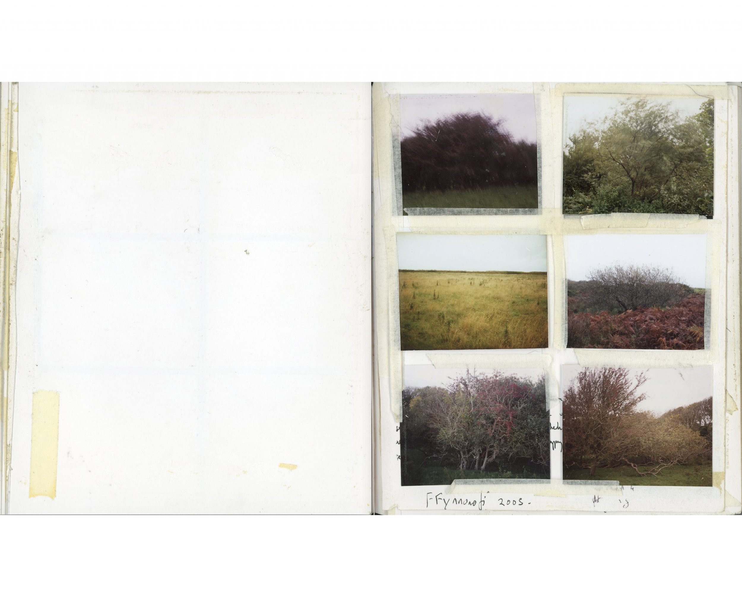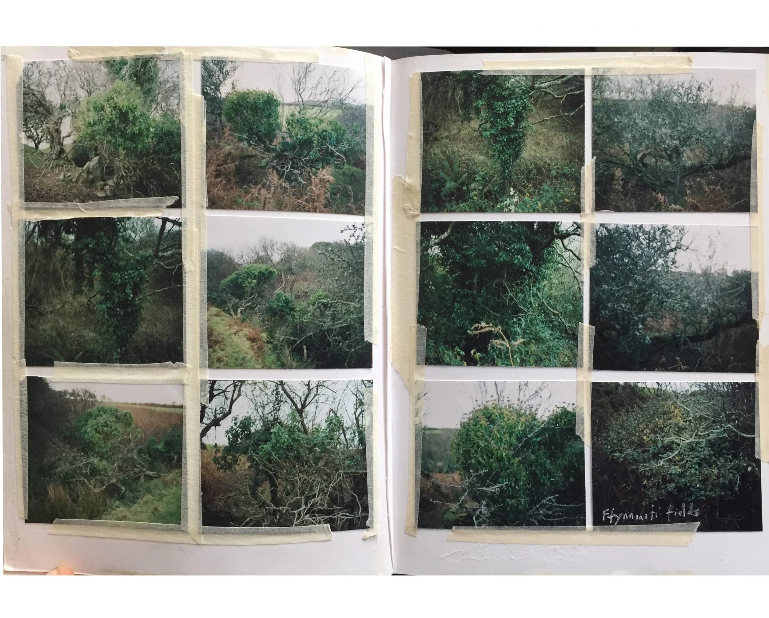 Alongside my large scale landscapes and studio photographs of found objects, I make less formal work in the shape of a workbook. It’s a little bigger than A5 and consists of 6×7” film contact prints, 6 to 12 images to a page. The photographs are taken around a small holding, Ffynnonofi, where I live and work in West Wales.
