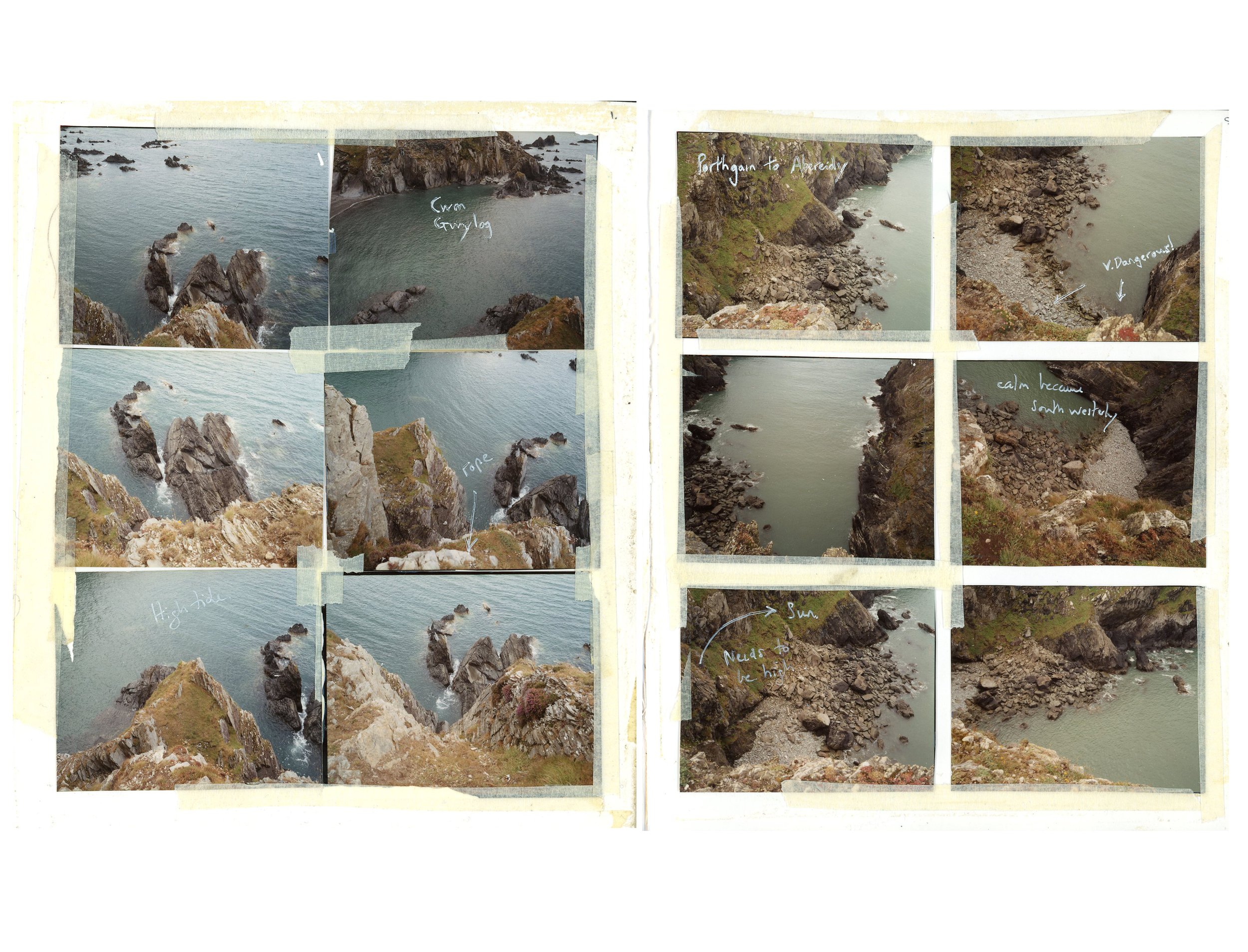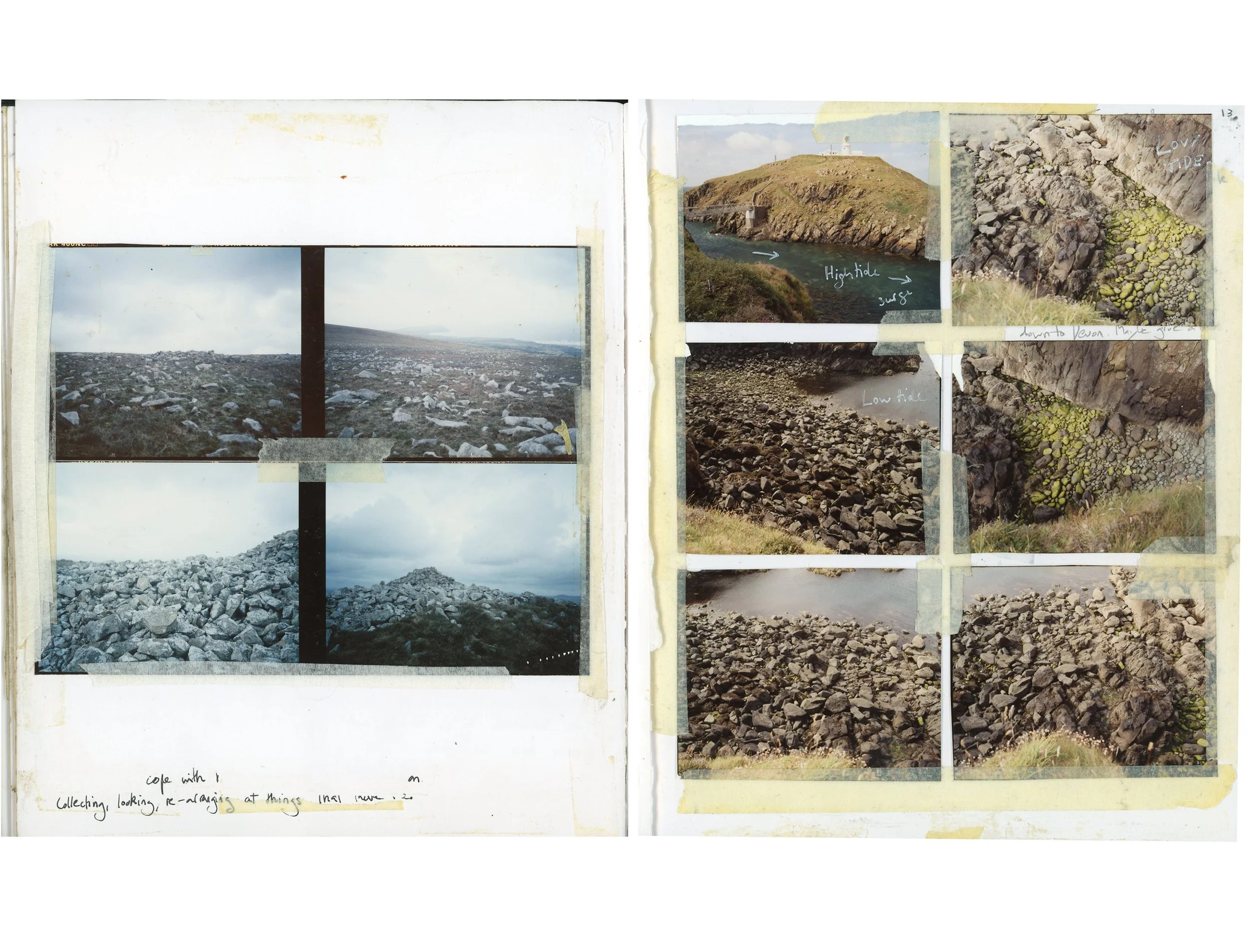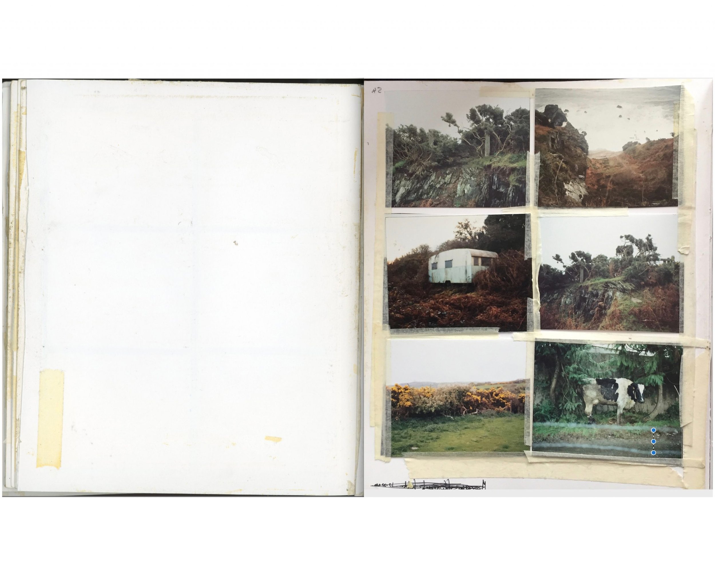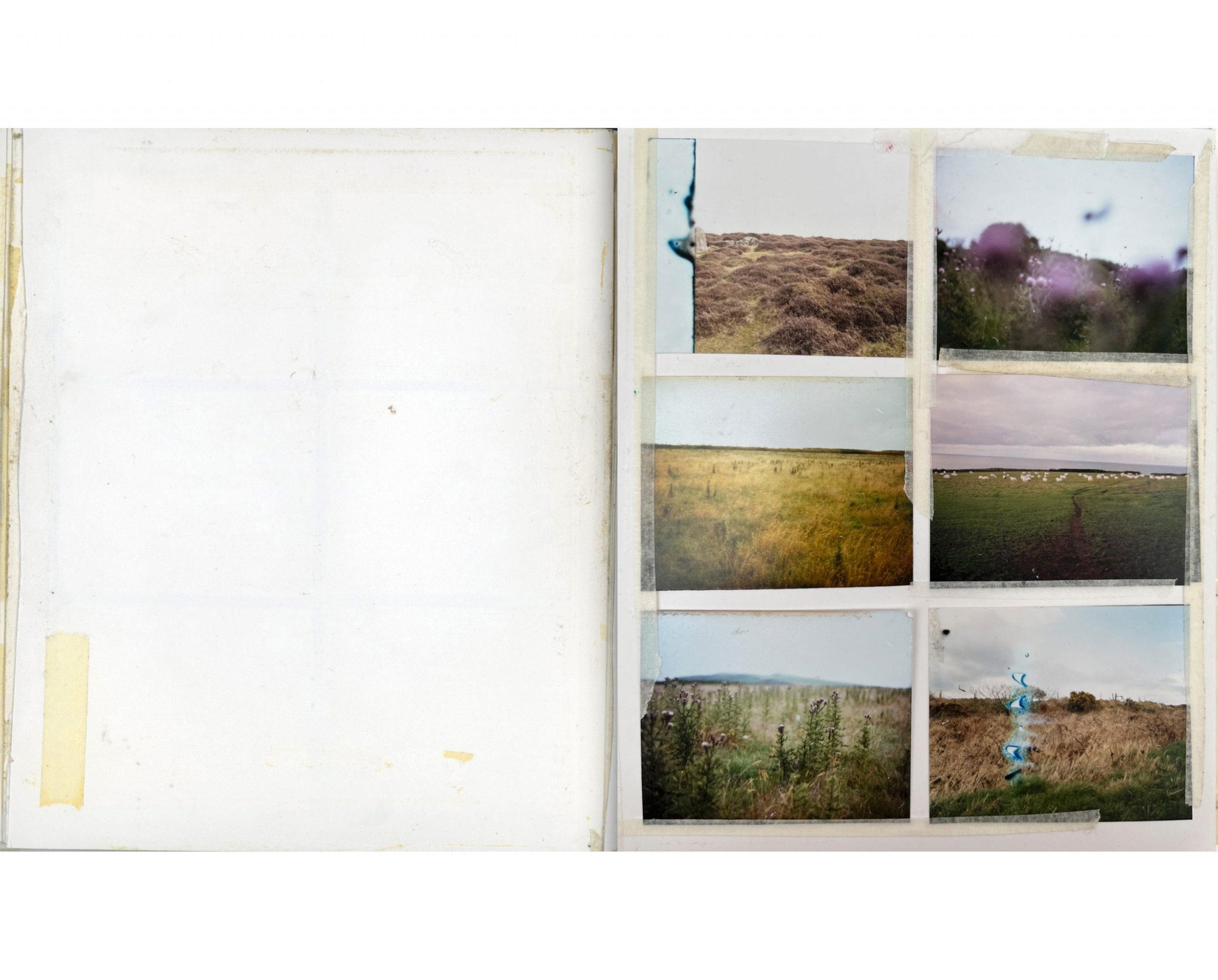 Alongside my large scale landscapes and studio photographs of found objects, I make less formal work in the shape of a workbook. It’s a little bigger than A5 and consists of 6×7” film contact prints, 6 to 12 images to a page. The photographs are taken around a small holding, Ffynnonofi, where I live and work in West Wales.