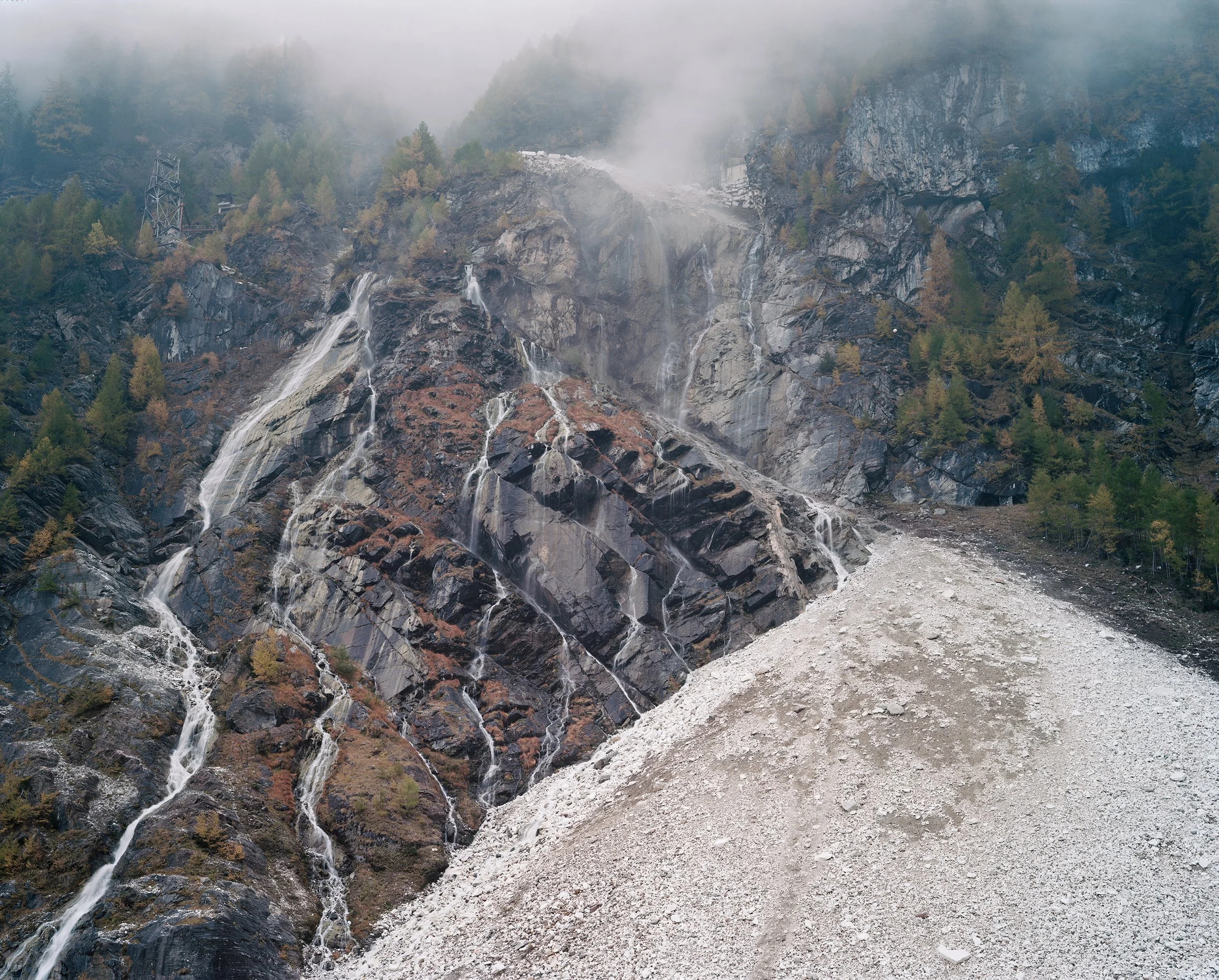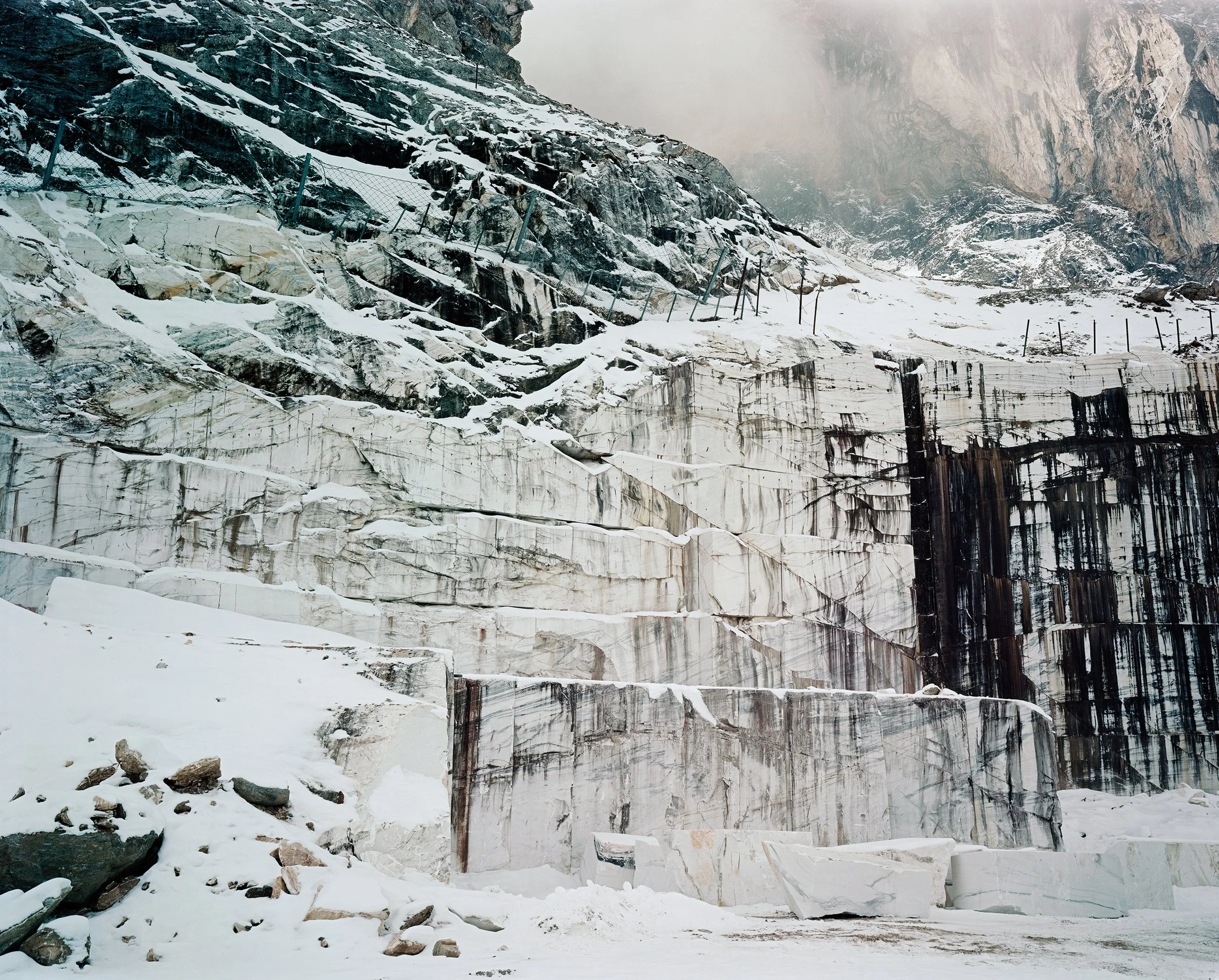 This environmental narrative is perhaps most explicit in the series White Gold, Perry’s photographs of marble quarries in Germany’s South Tyrol. Here, instead of sidelined Celtic backwaters, he gives us the drama of a heavy, luxury industry where the unusually pure white stone, destined to be fashioned into bathroom tiles for the world’s super rich, has been mined rapaciously. In White Marble Scree, Cava di Marmo, Weisswasserbruch, Jennwand, Sudtirol Oct 2010 the veins of a waterfall trickling down the side of a mountain is parodied by discarded marble rocks, spewing in a great triangle across the water’s path. With White Marble Face, Cava di Marmo, Wandbruch, Weisswand, Sudtirol Oct 2010, the quarry itself becomes a haphazard grid of angry black lines cut into the precious white commodity.